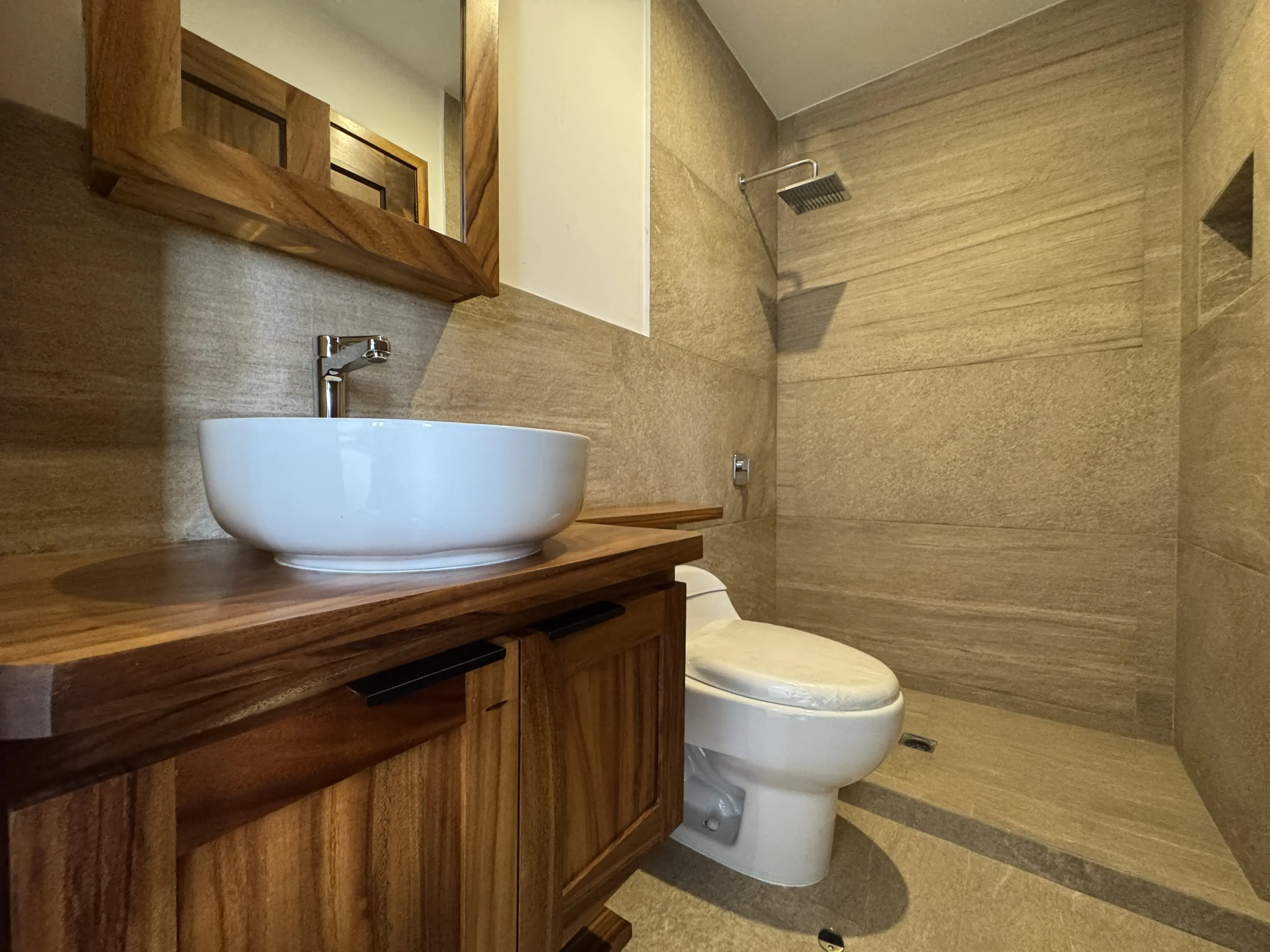 • Bathrooms: Bowl-type countertop sinks on solid wood cabinets, with framed mirrors and stone-style ceramic tile showers.