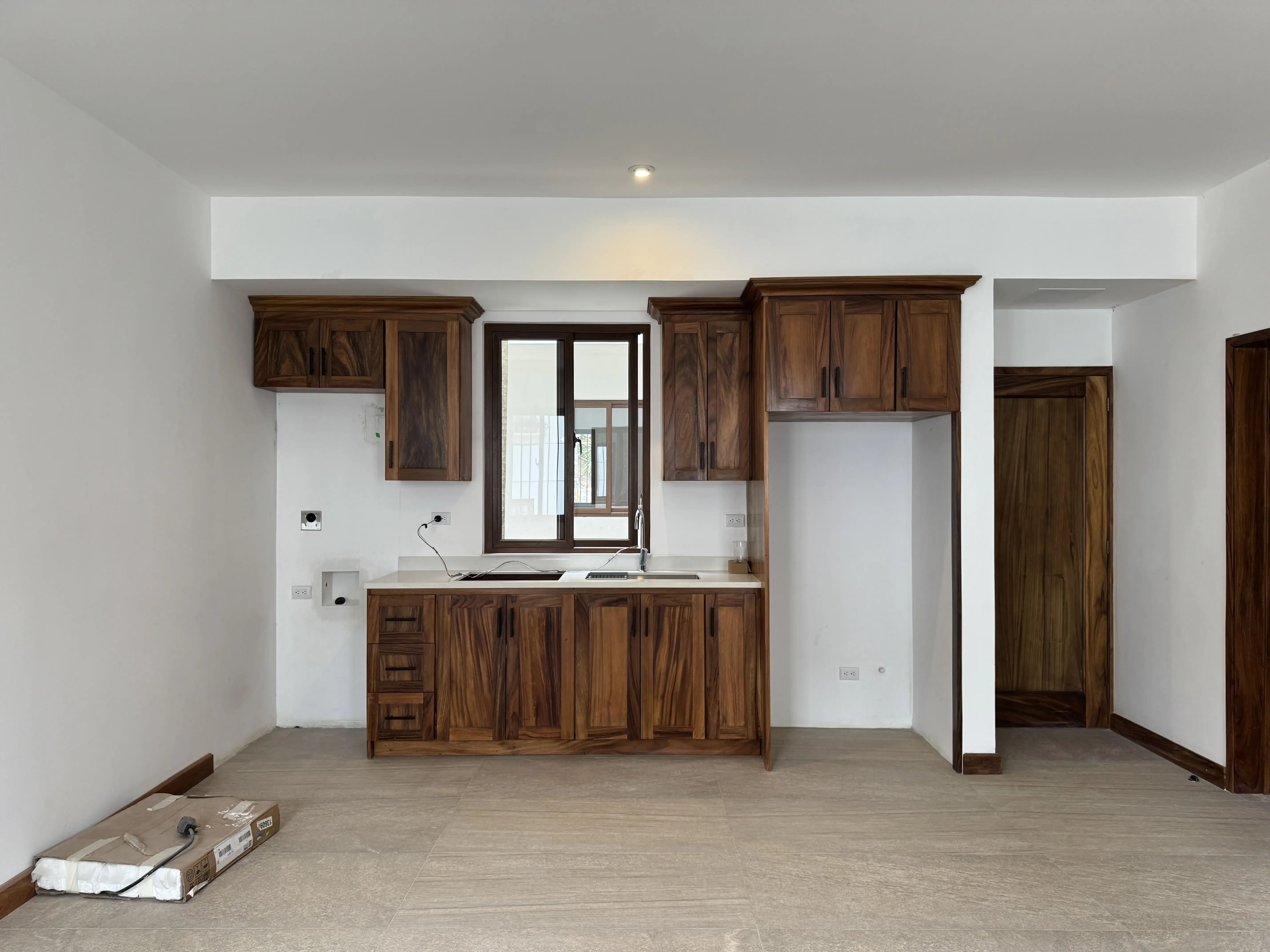 • Solid wood carpentry: Kitchen cabinets, doors, and closets made of wood with natural grain.