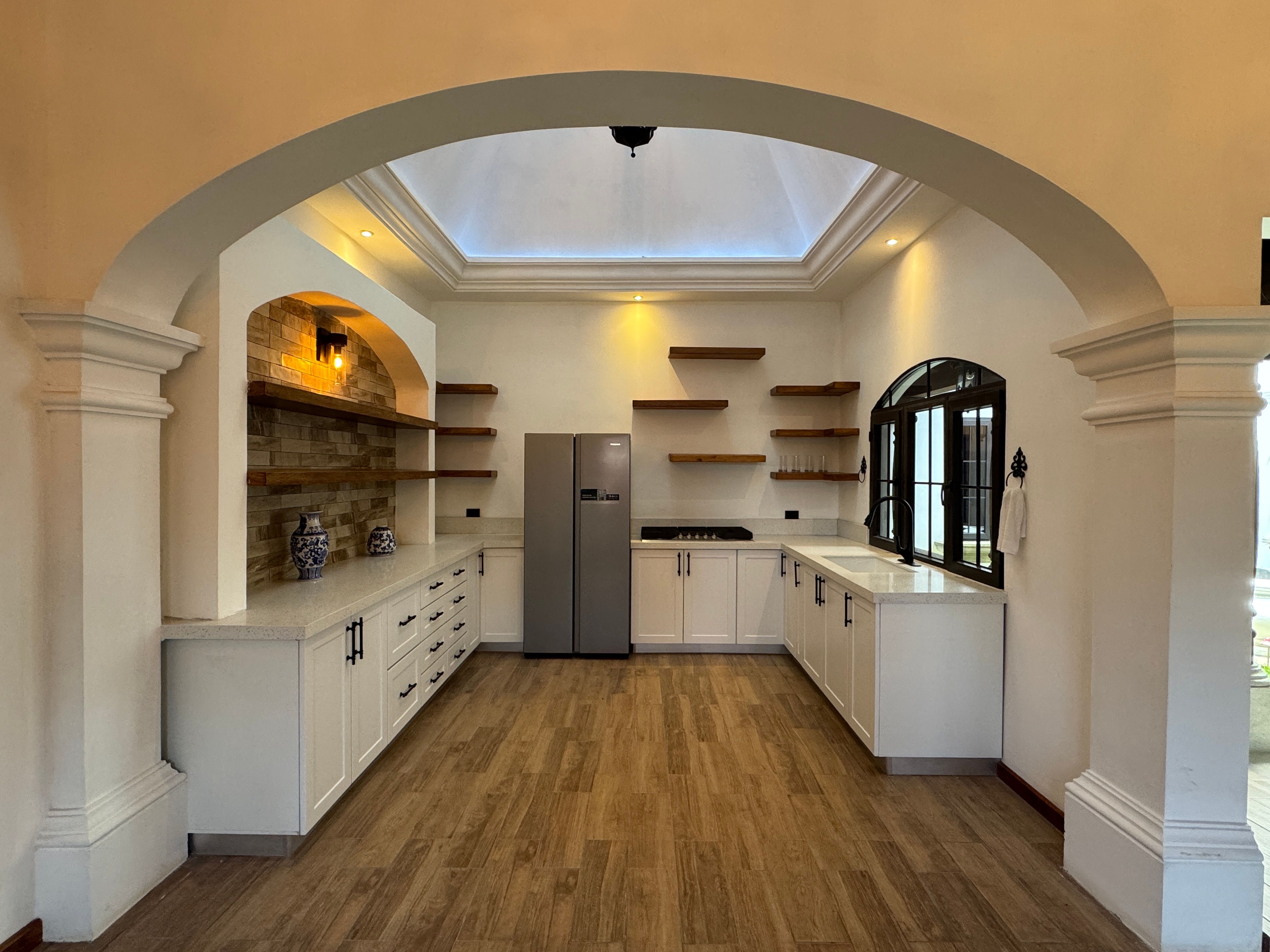 This colonial house stands out for its social area, which has incredible natural lighting. The kitchen is a true gem, highlighted by its ceiling skylight and a molded arch that gives it an undeniable colonial feel. Other architectural details that enhance its character include the Spanish terrace in the first-floor hallway, a traditionally designed búcaro, and high, double-height wooden ceilings.