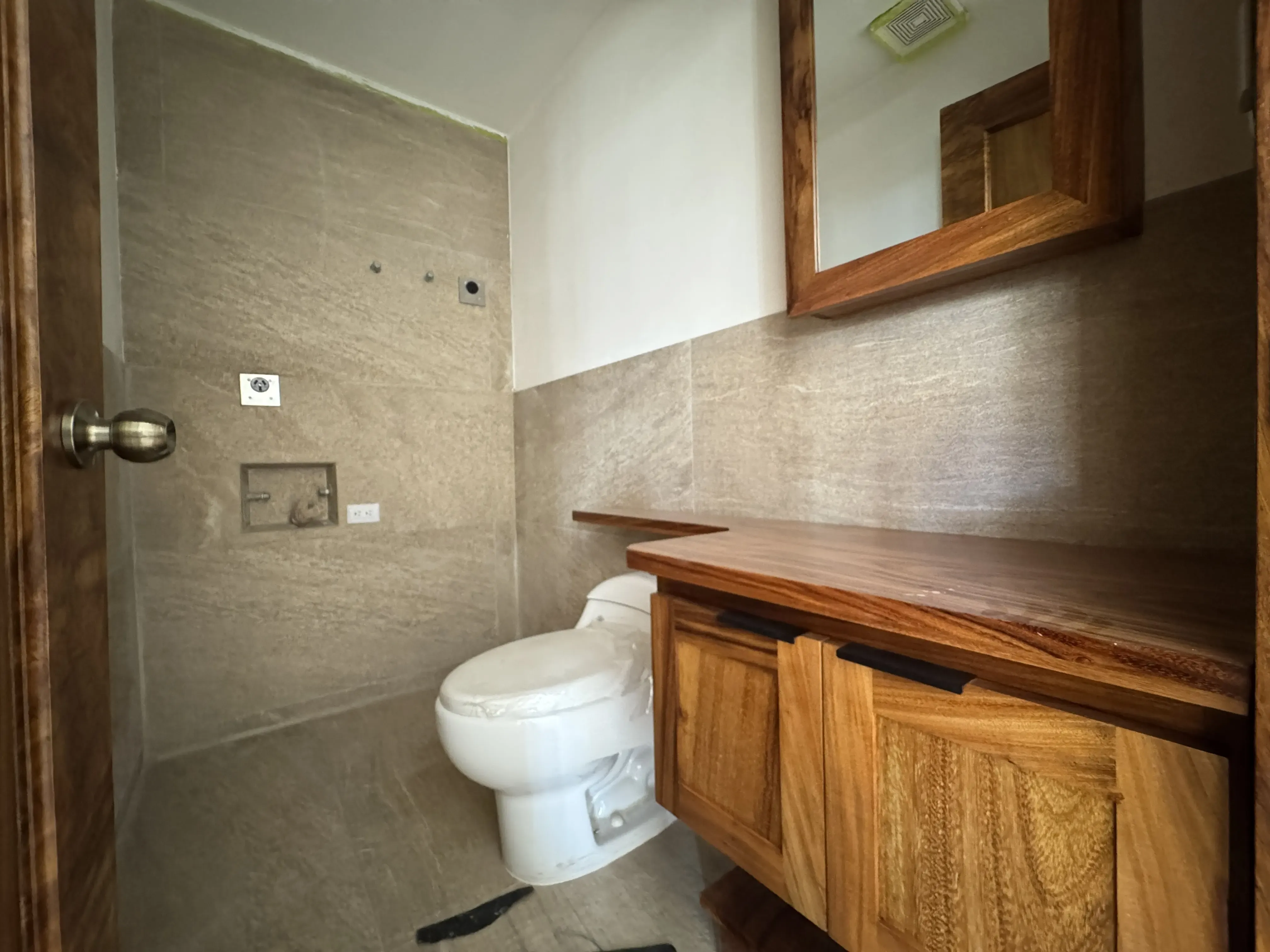• Baños modernos: Top de madera en lavamanos, manteniendo la línea orgánica del diseño.