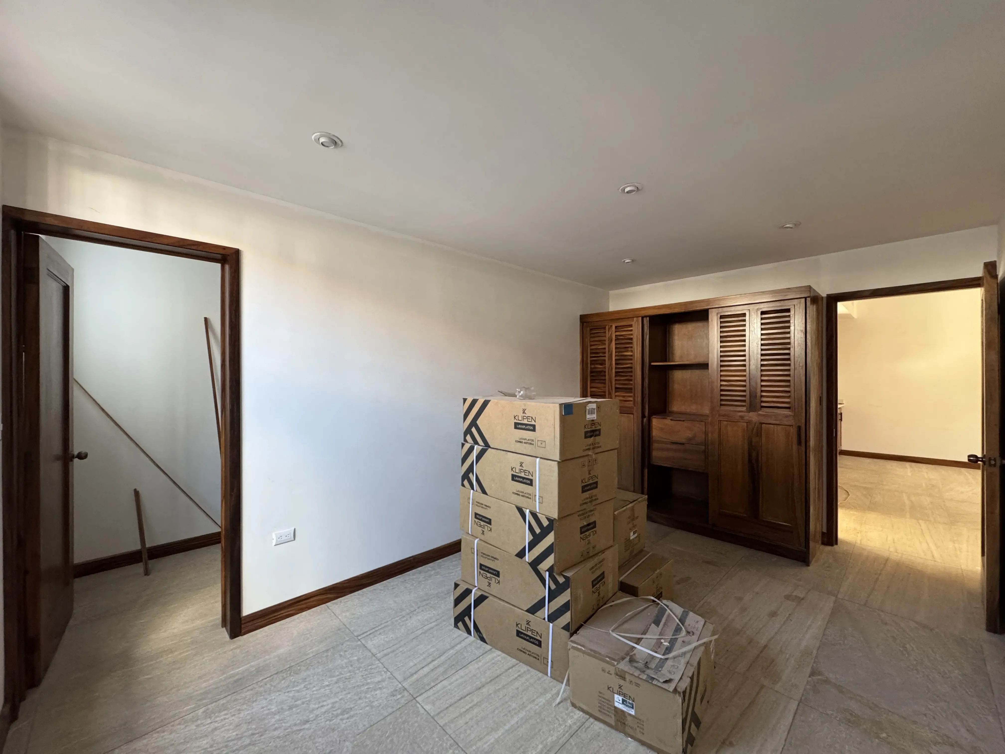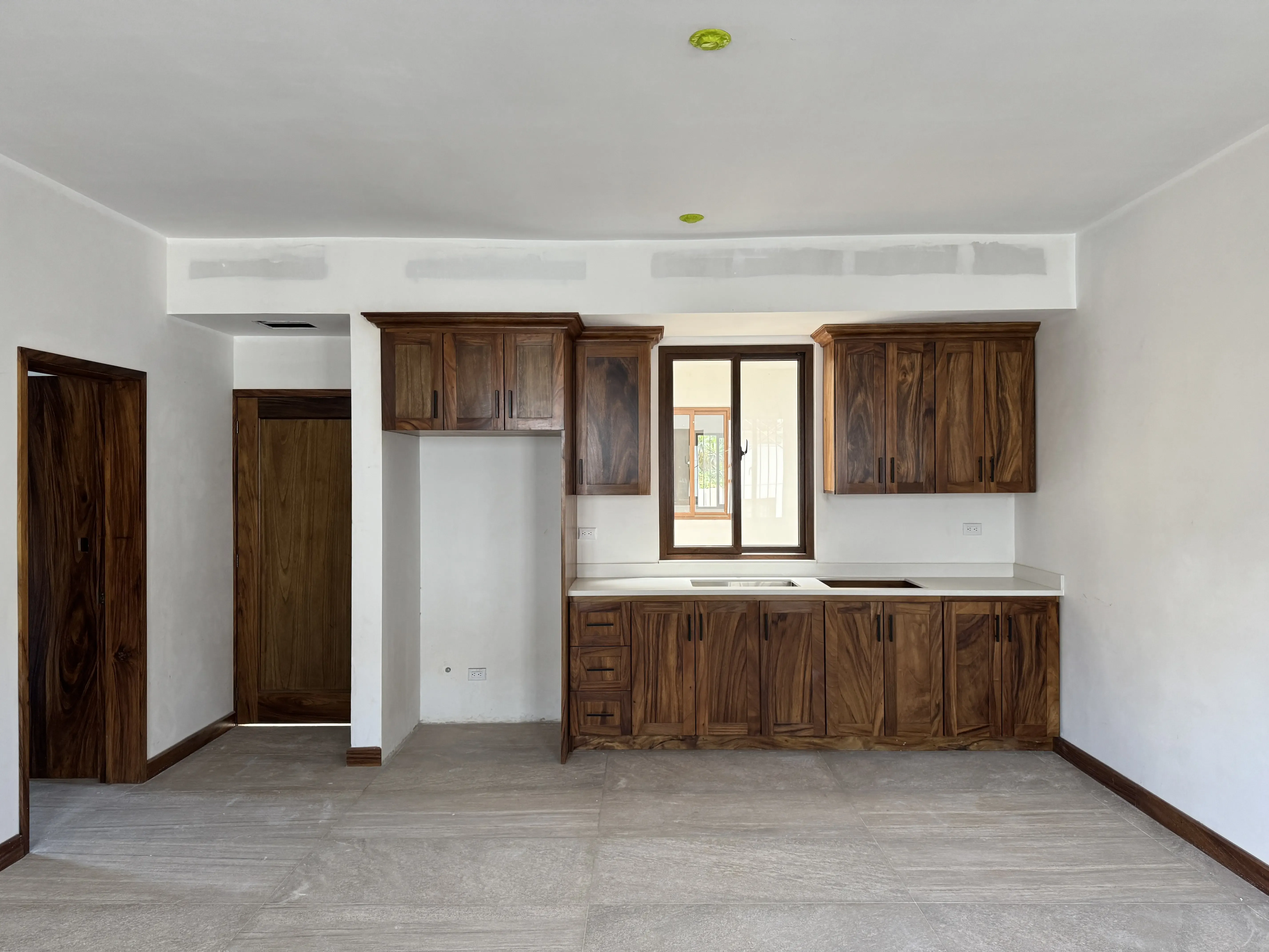 • Carpintería: Gabinetes de cocina y closets elaborados en madera sólida con vetas naturales profundas, aportando calidez y elegancia.