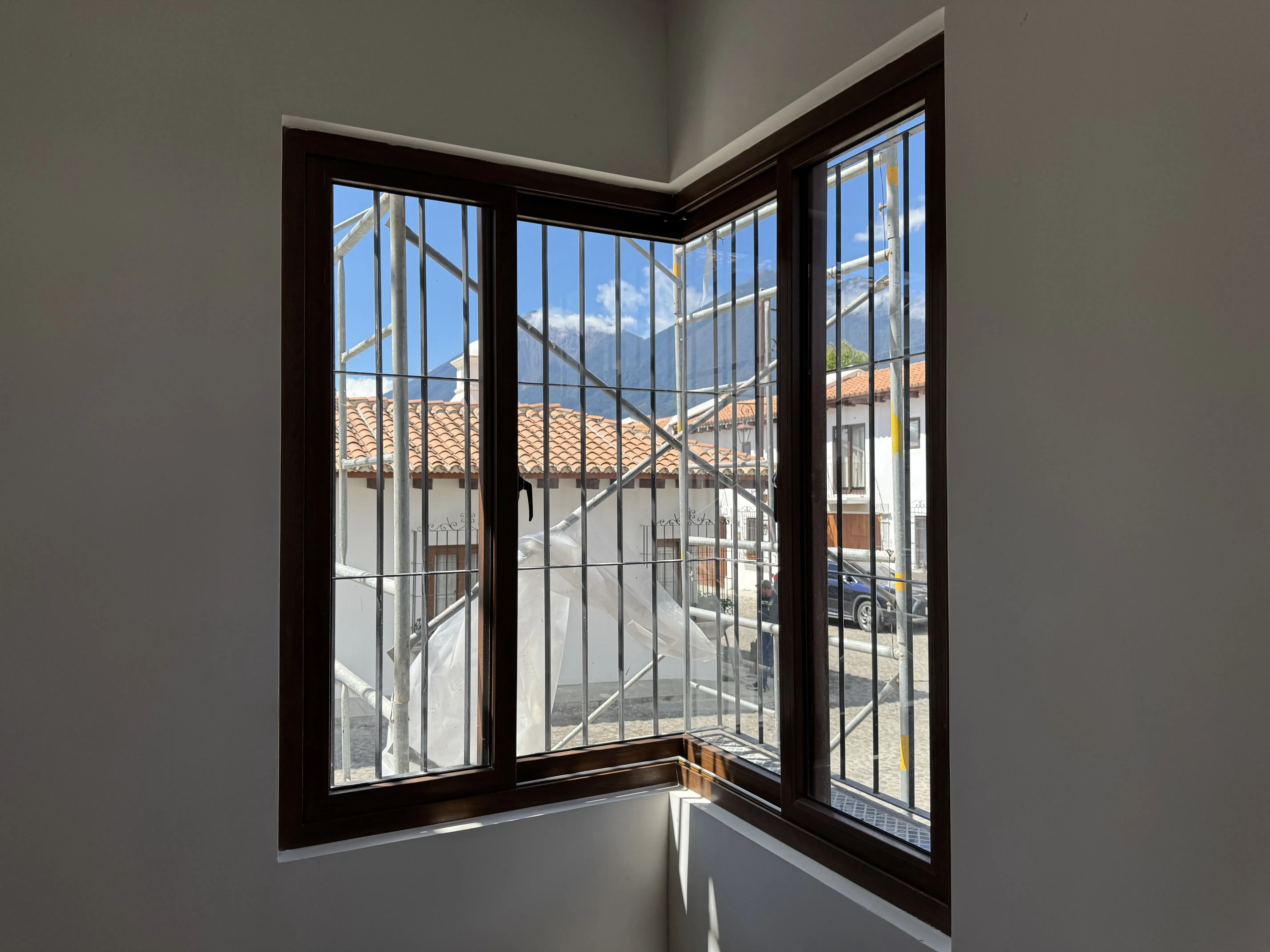 • Iluminación natural: Ventanales con marcos de PVC imitación madera que enmarcan las vistas hacia los tejados coloniales y el volcán.