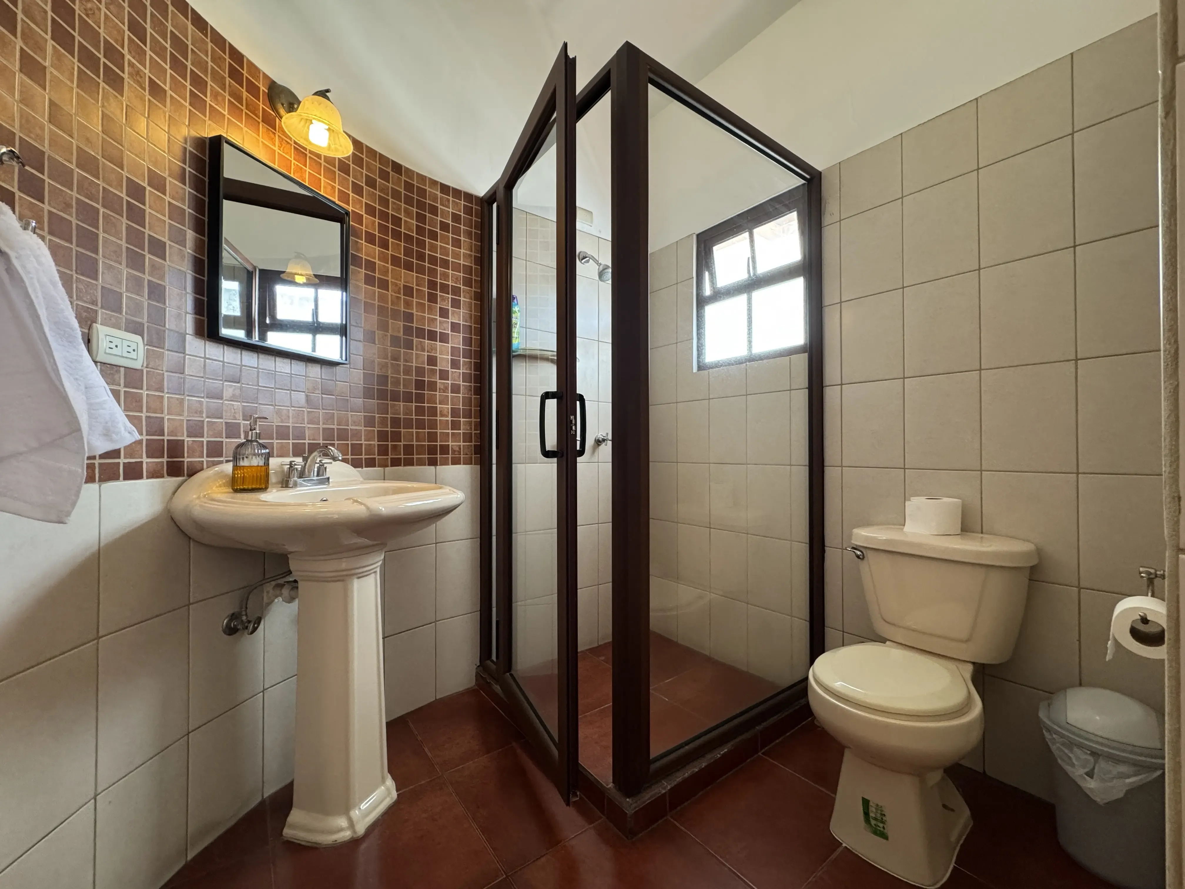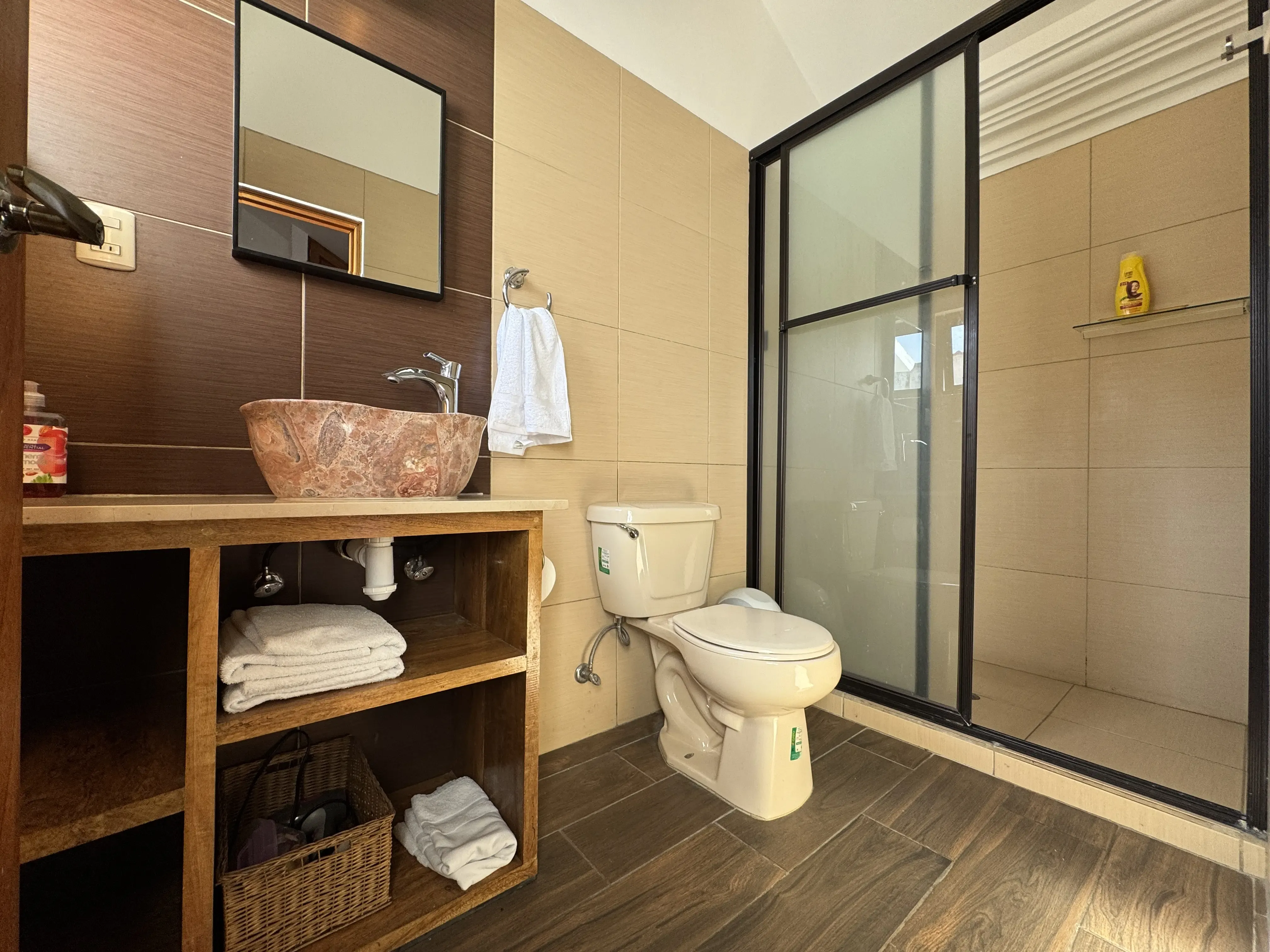 - Diseño interior: Los baños cuentan con lavamanos artesanales de piedra tallada sobre muebles de madera sólida, complementados con azulejos decorativos en tonos cálidos.