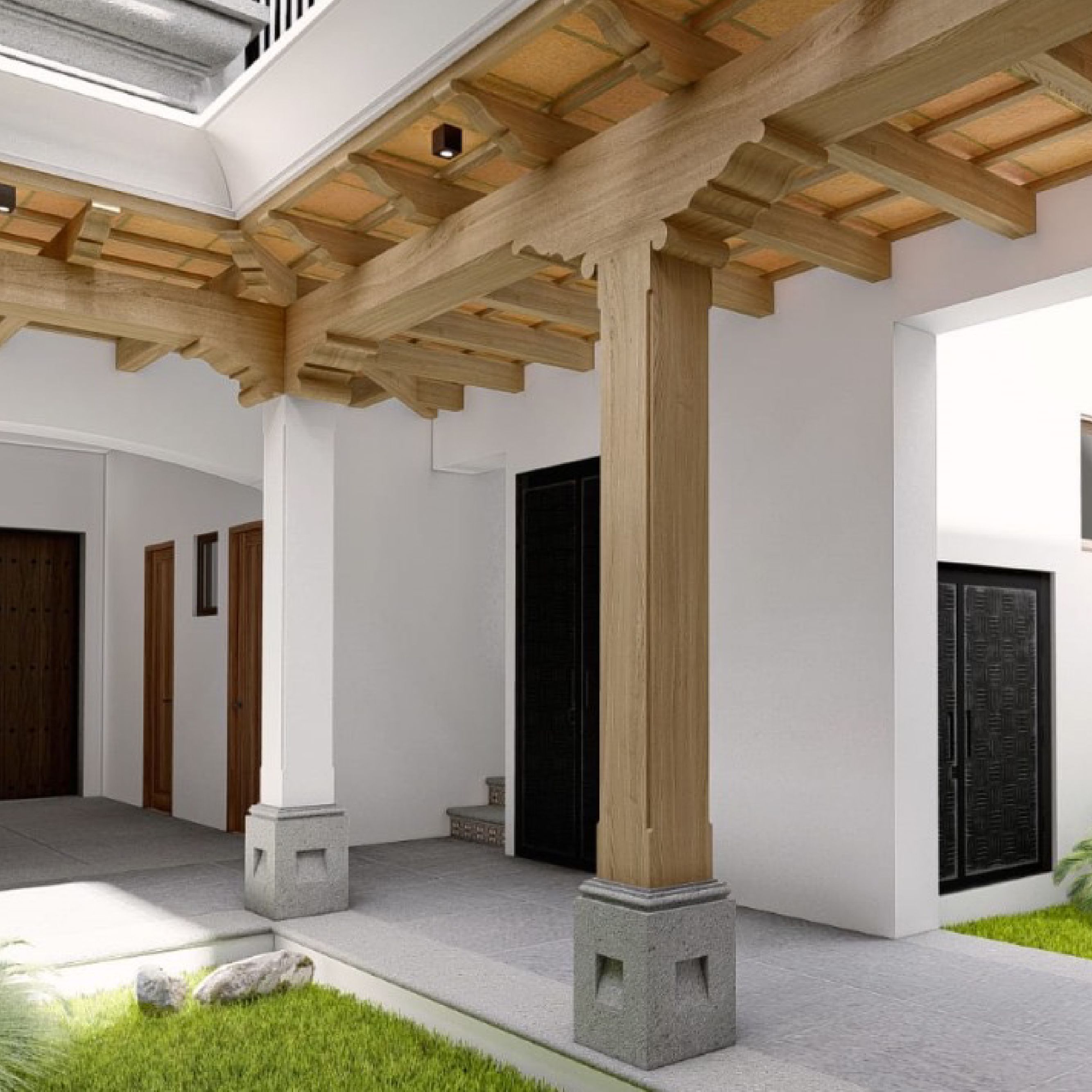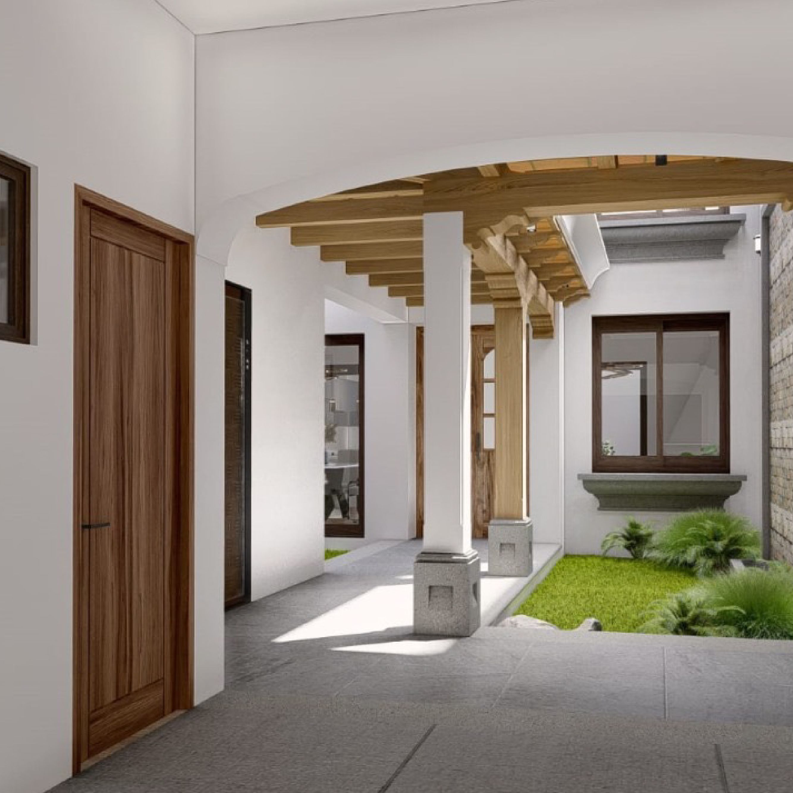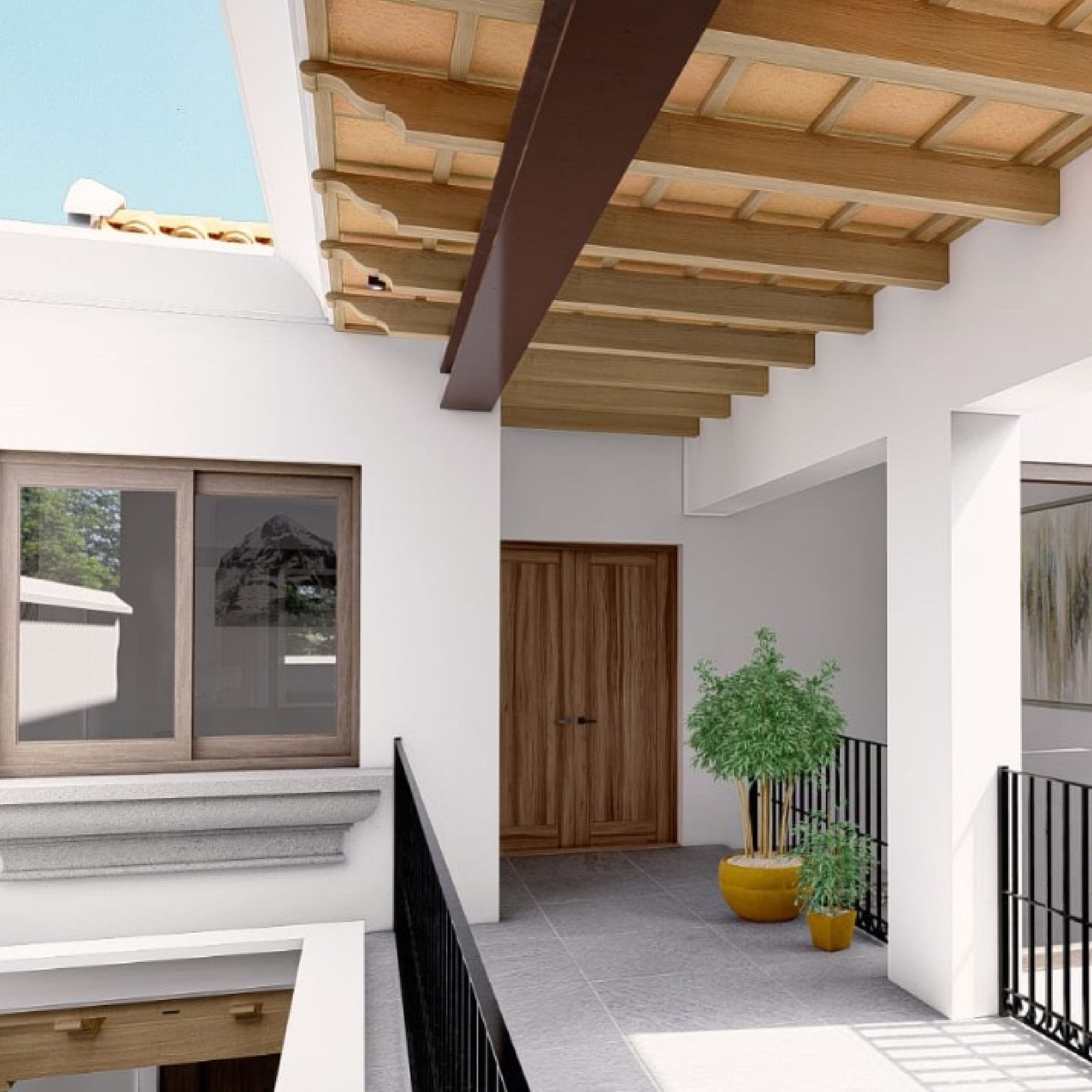 • Detalles Coloniales: Corredores exteriores con terraza española, dormitorios con techos de artesón de madera.