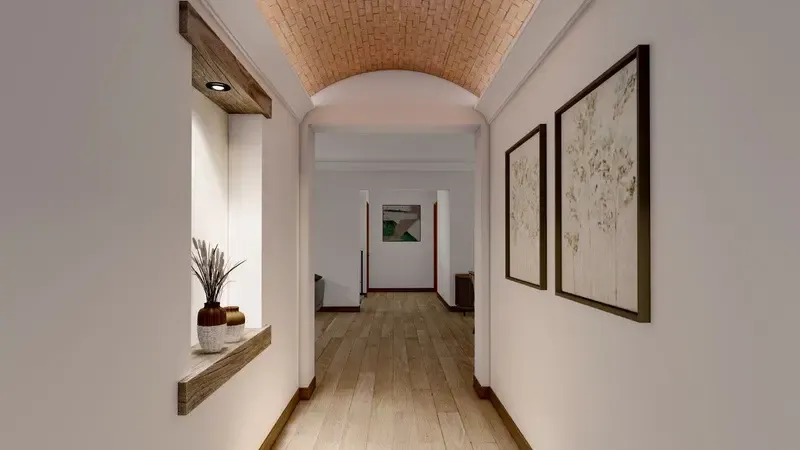 Bóveda de ladrillo: Techo de cañón en el pasillo principal que realza el carácter artesanal.