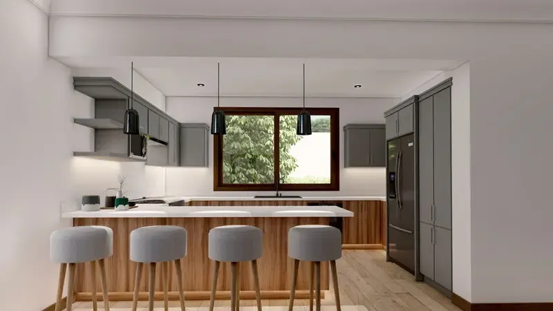 Acabados premium: Cocina moderna con top de cuarzo y baños con acabados contemporáneos.