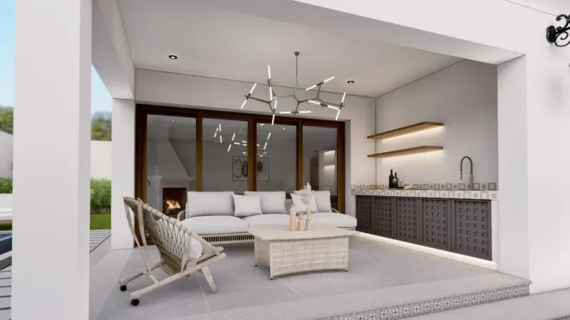 Integración total: puertas corredizas de piso a techo que permiten fusionar la sala y el comedor con el área del jardín y la pérgola.