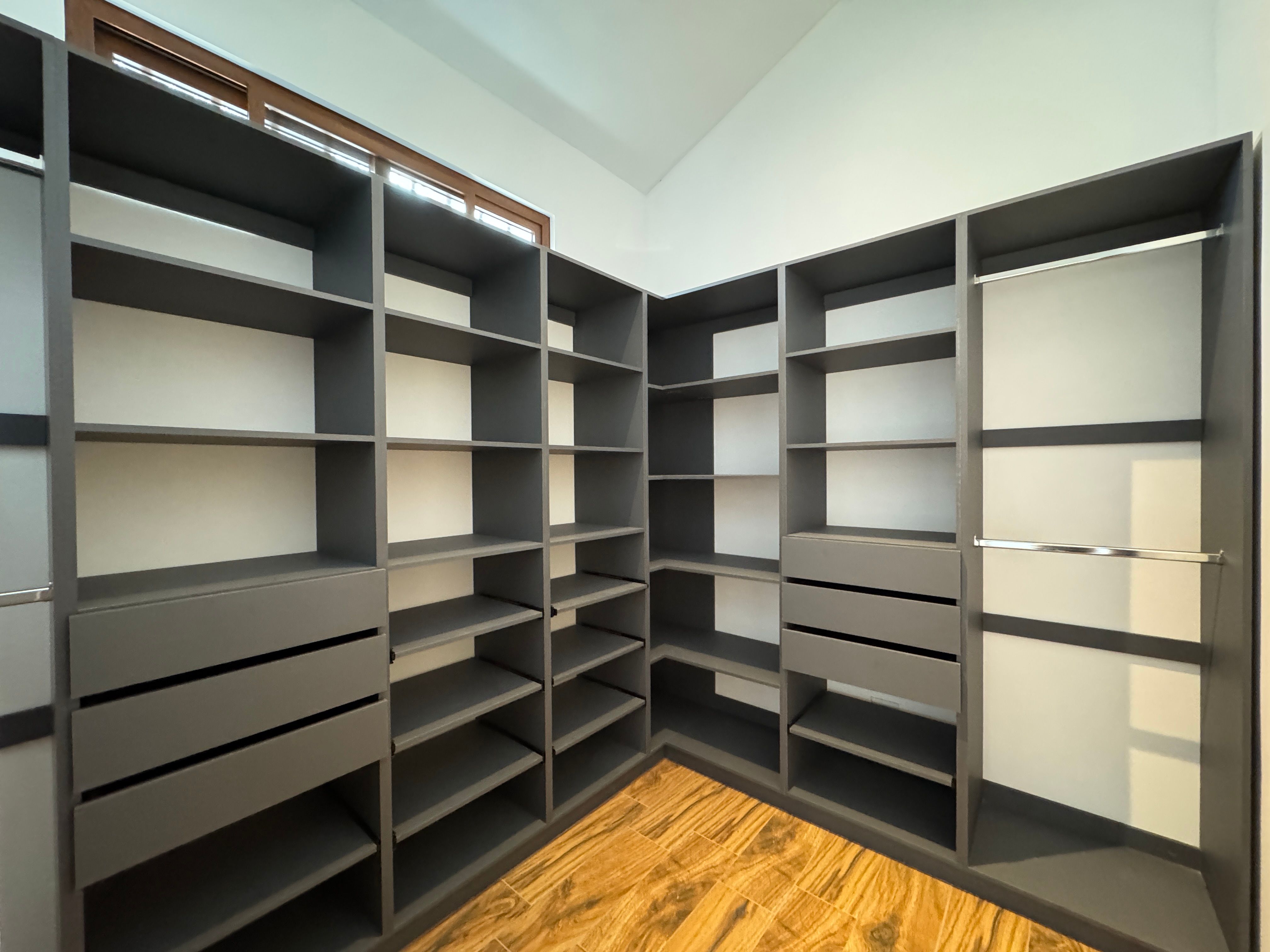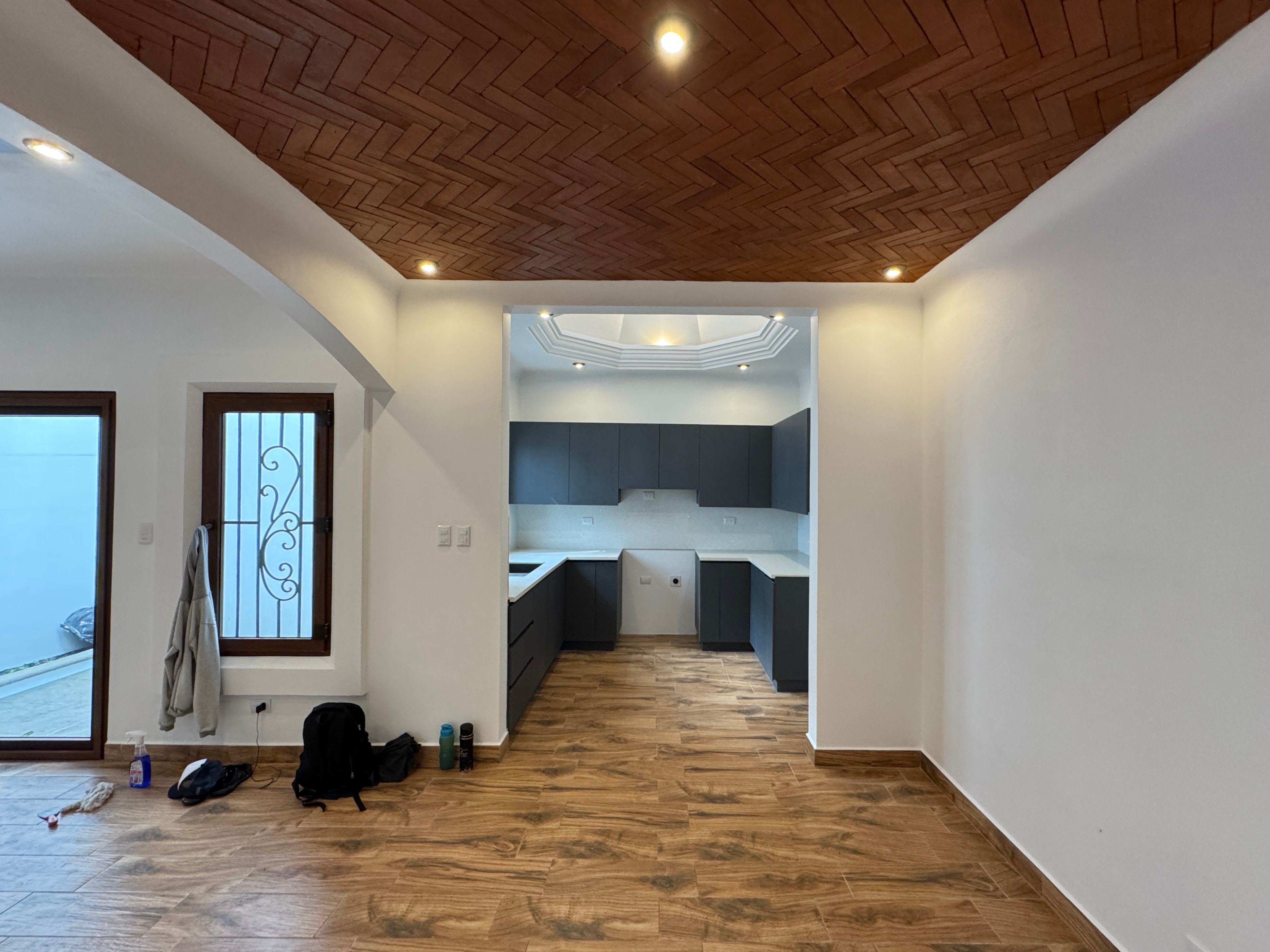 - Cocina con gabinetes, top de cuarzo y linternilla