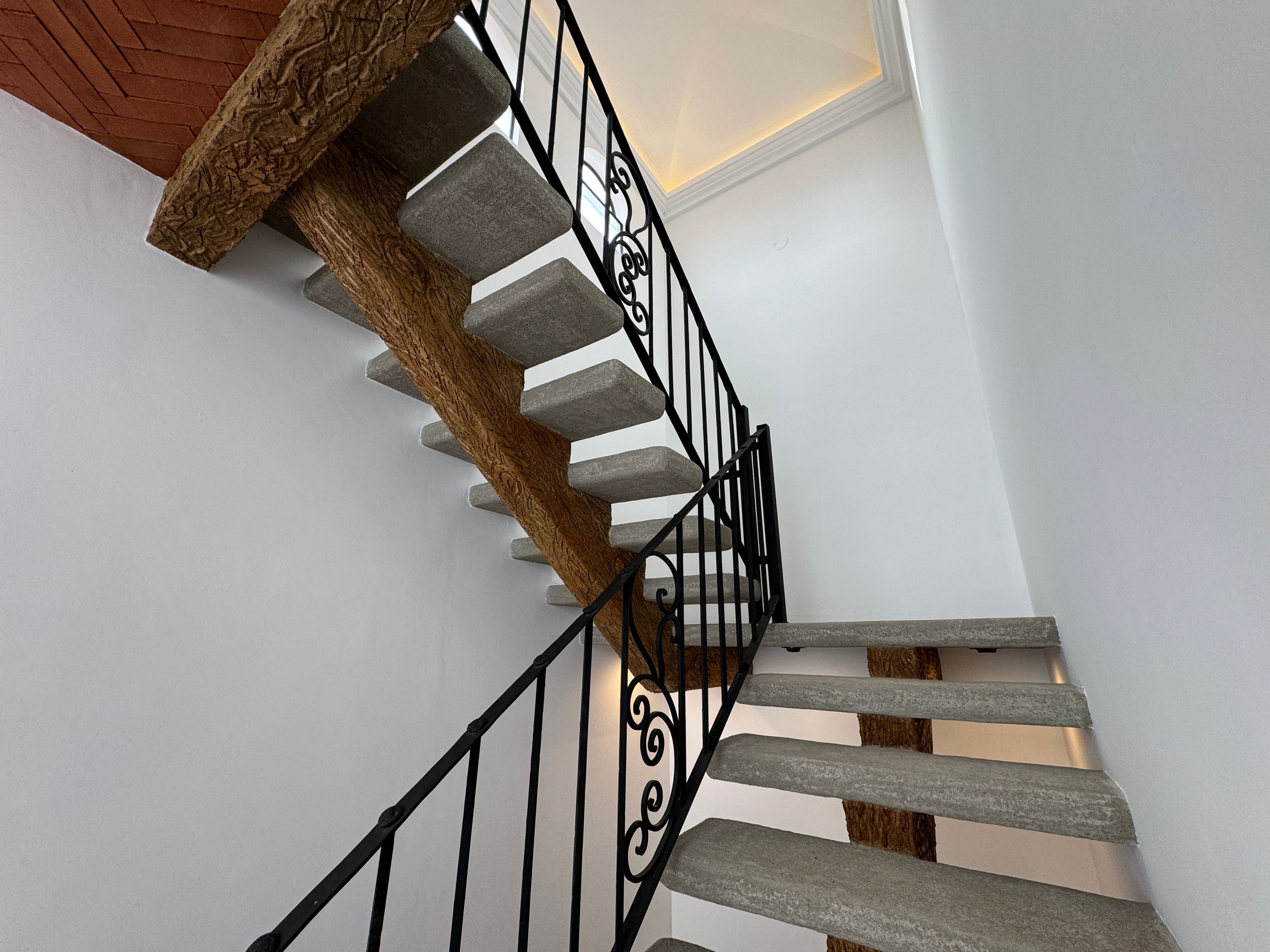 Contrahuella en gradas, gradas voladizas de concreto con textura, dormitorios amplios con bastante iluminación natural y cada uno con su propio baño.