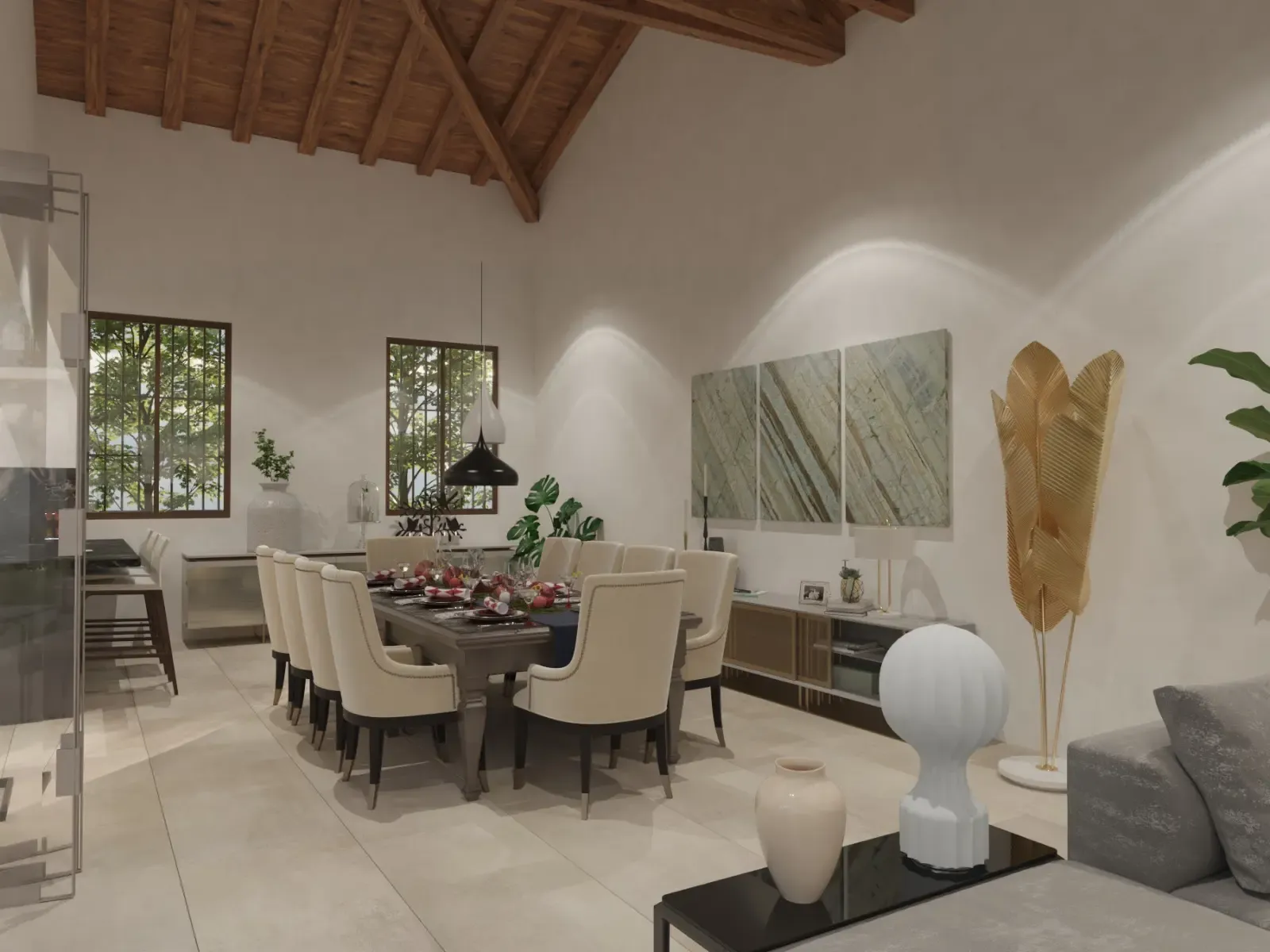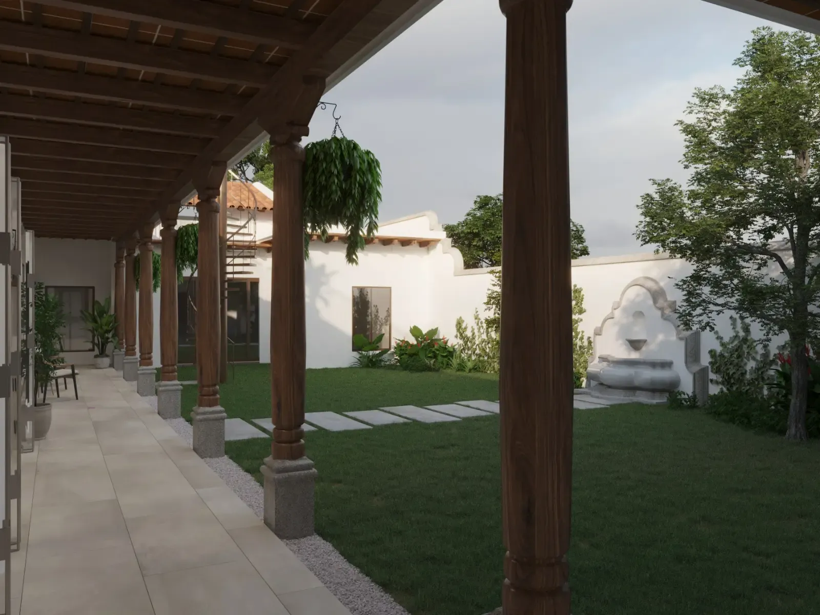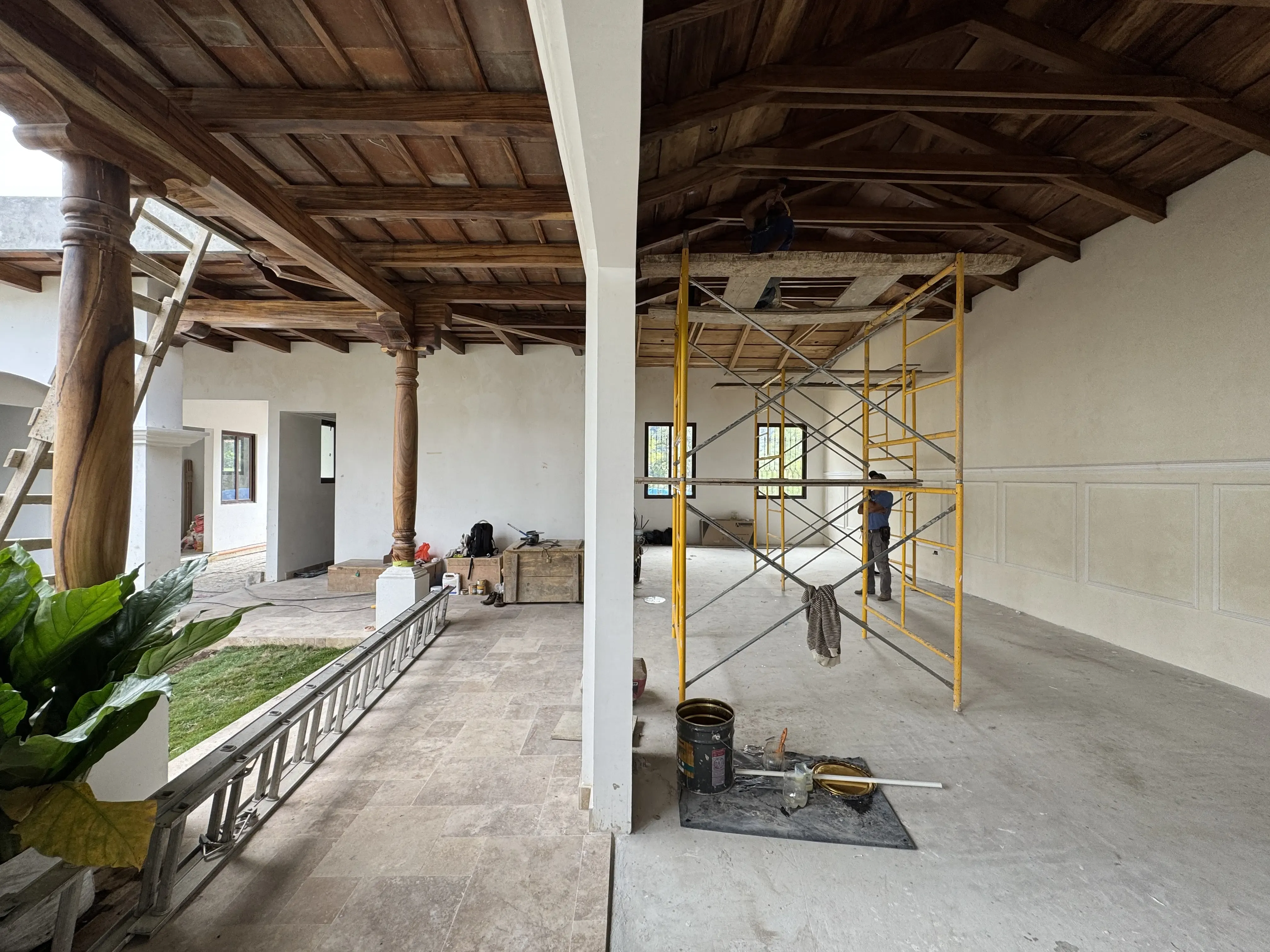 - Techos inclinados con madera de ciprés y tejas de cerámica.
