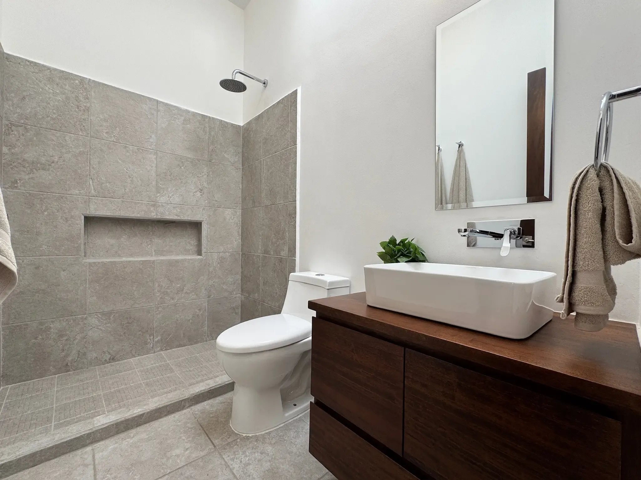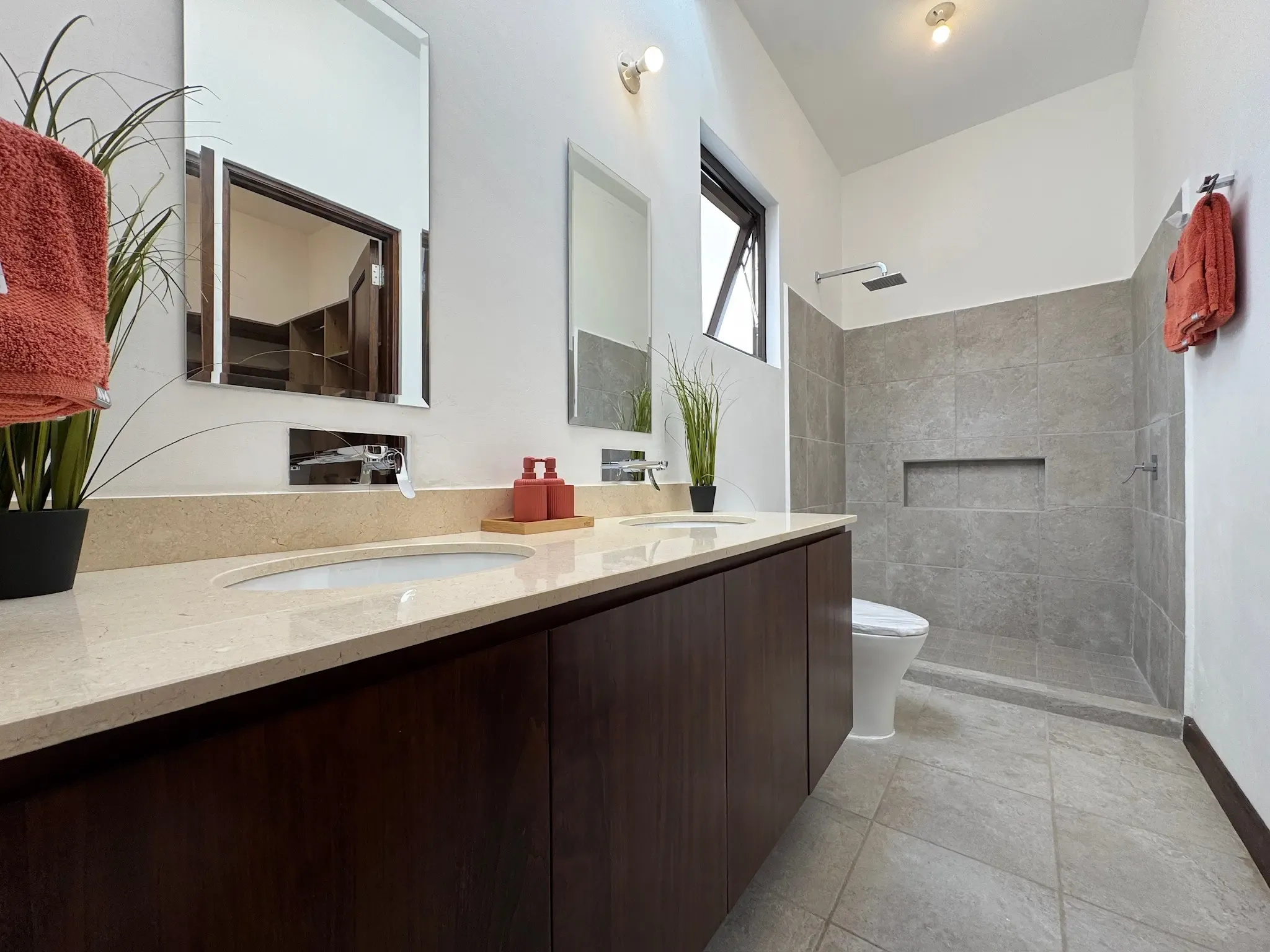 - Baños Detallados: Los baños incluyen muebles, espejos y nichos en las duchas. Además, encontramos luz cenital (tragaluz) en los baños para iluminación natural.