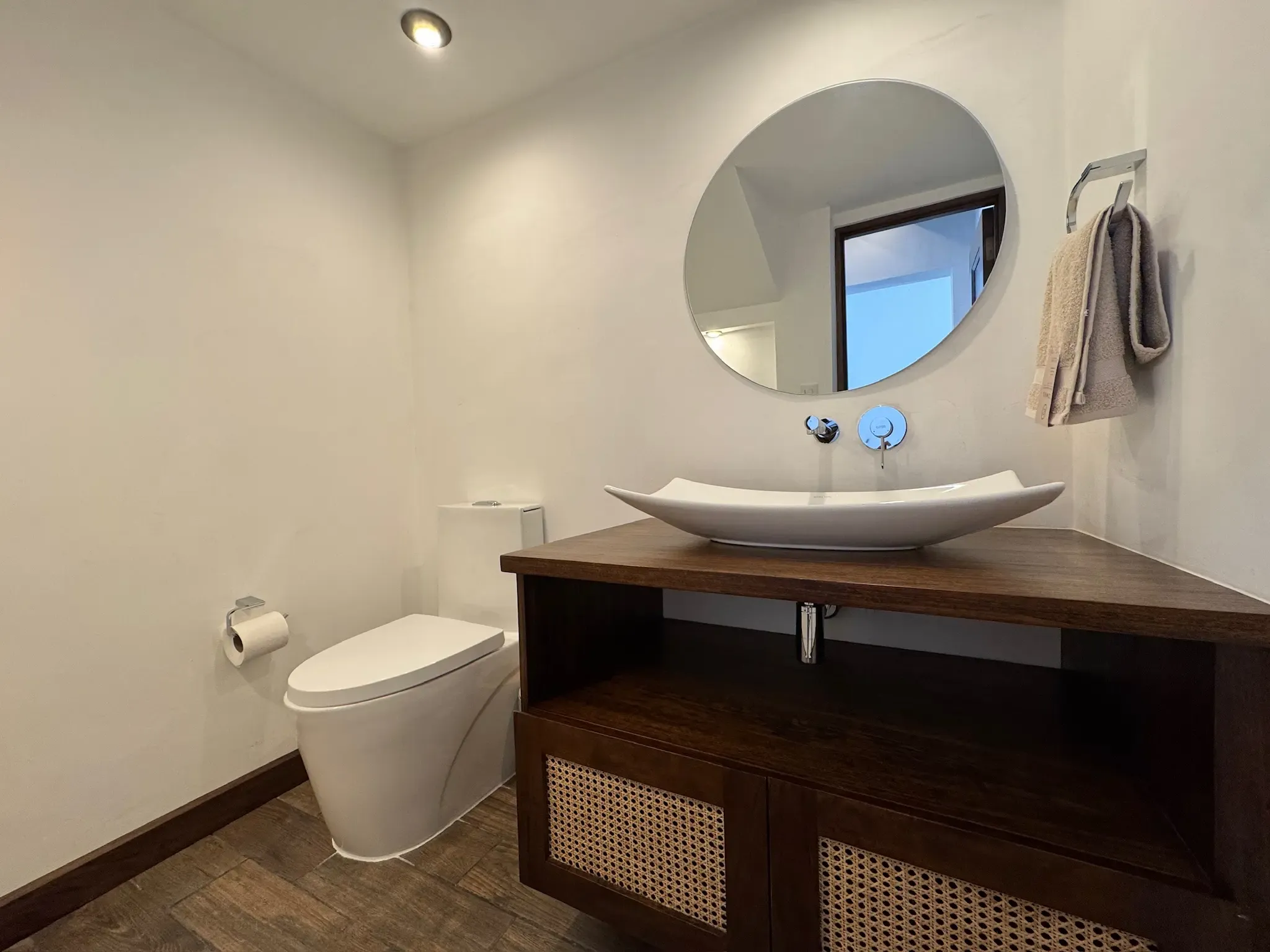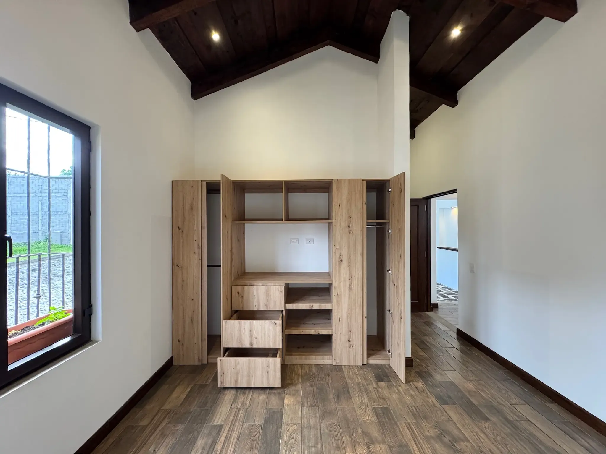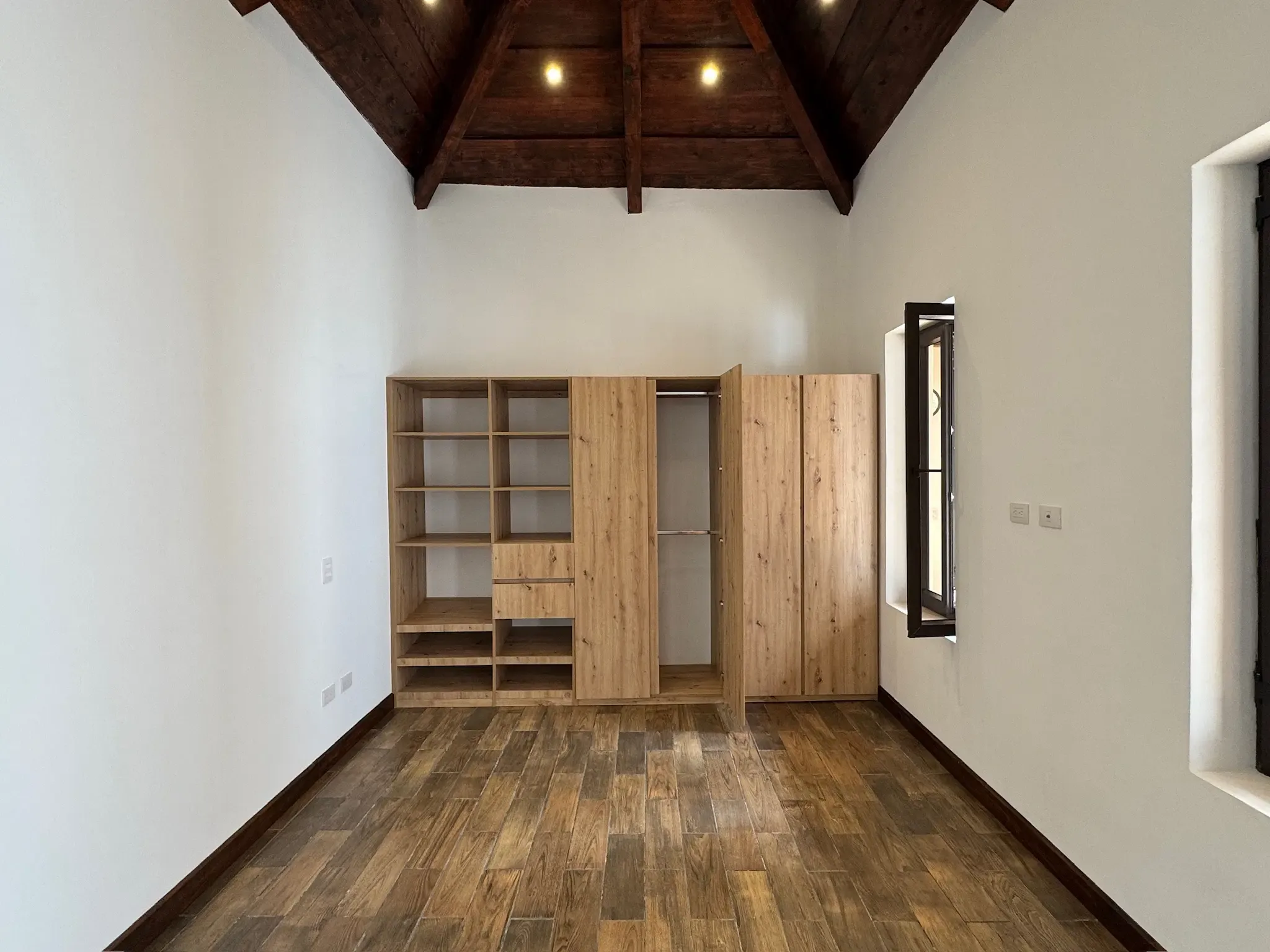 - Acabados en Madera y PVC: Tenemos acabados de madera de excelente calidad, zócalos de madera sólida y ventanería de PVC imitación madera. Los closets cuentan con sistema de cierre suave (soft close).