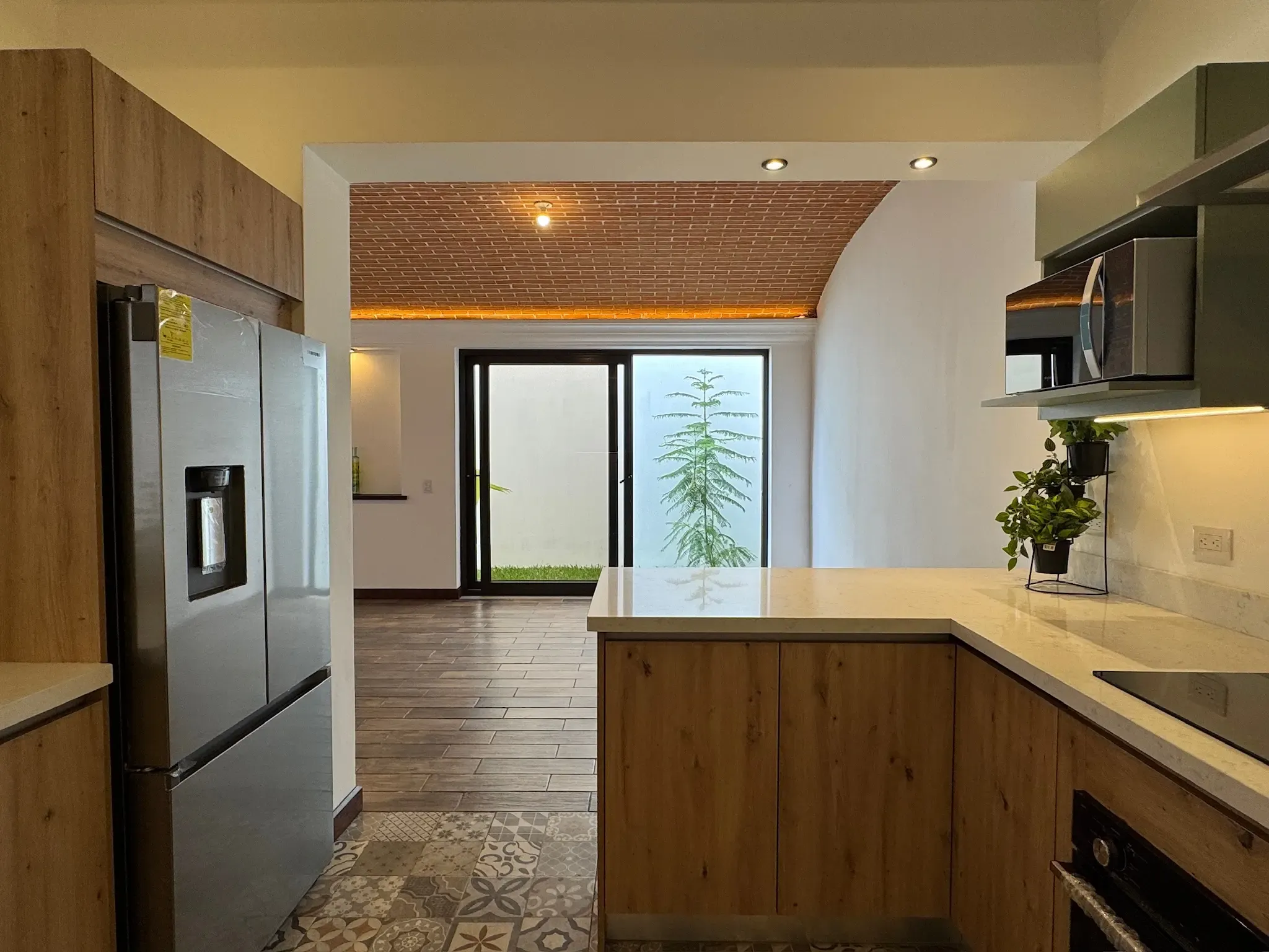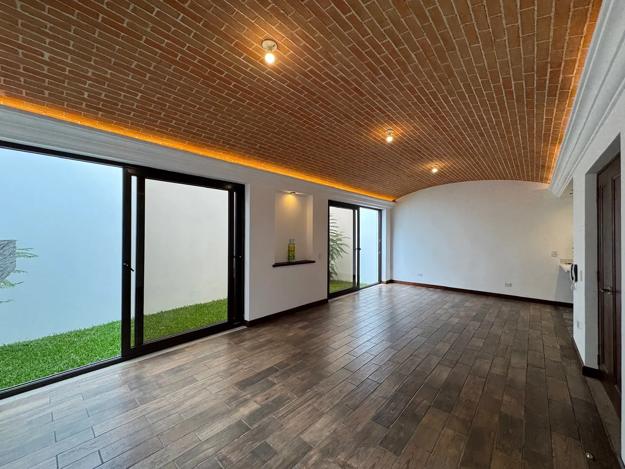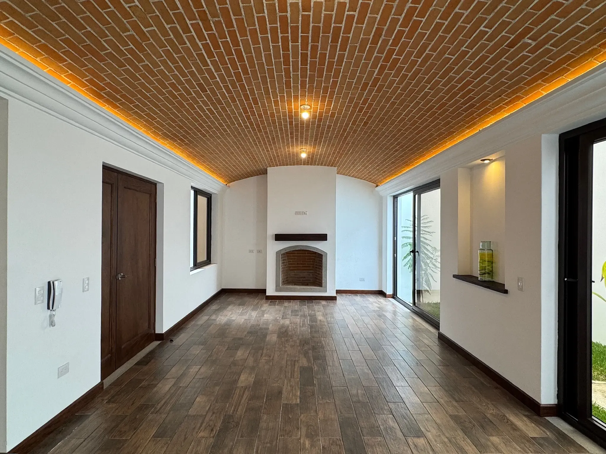- Ingreso y Área Social: Al entrar, tenemos una puerta ancha que da acceso al área social, donde encontramos una chimenea y una impresionante bóveda de ladrillo expuesto con iluminación indirecta. El piso es cerámico imitación madera, combinando durabilidad con calidez.