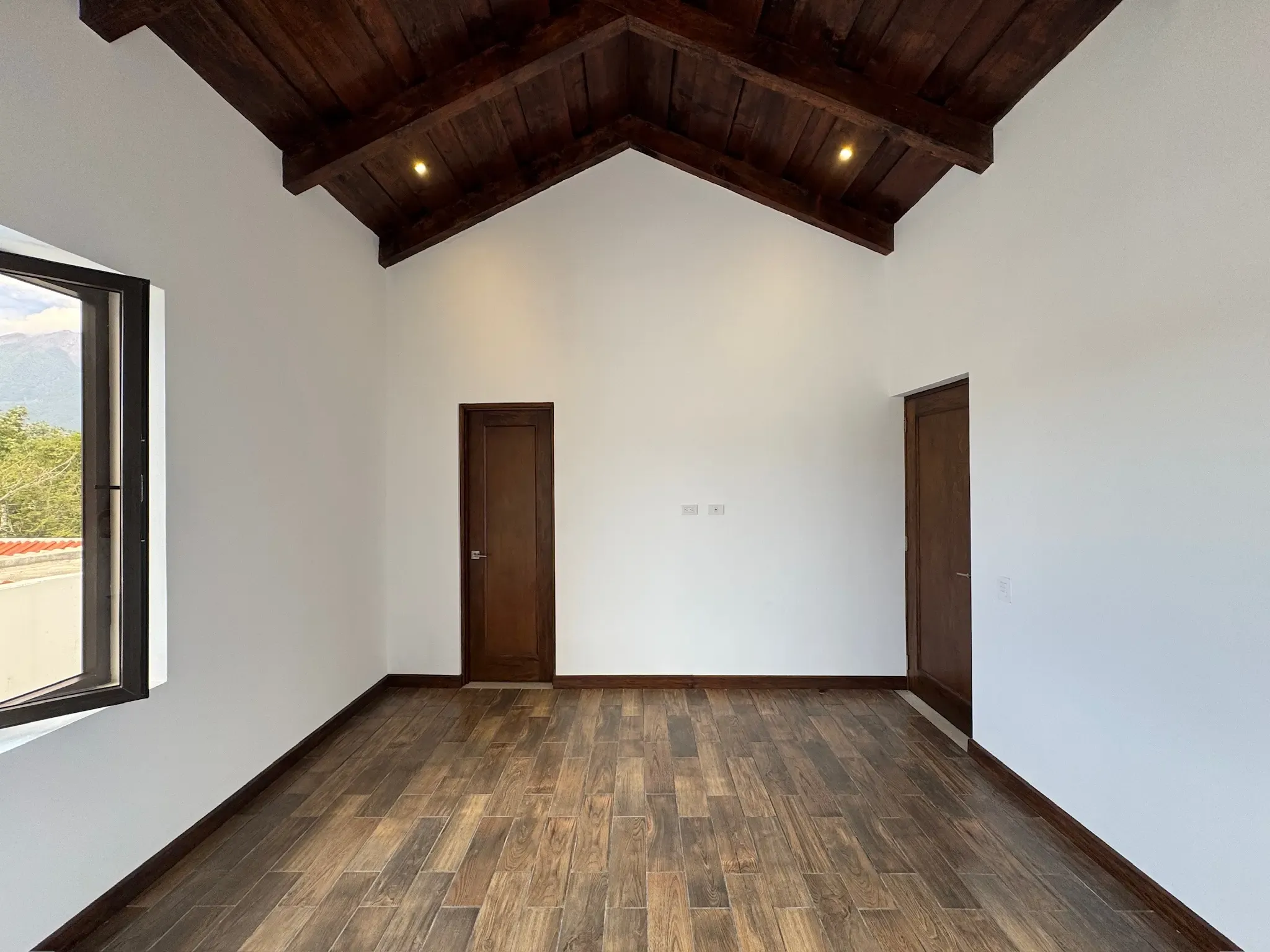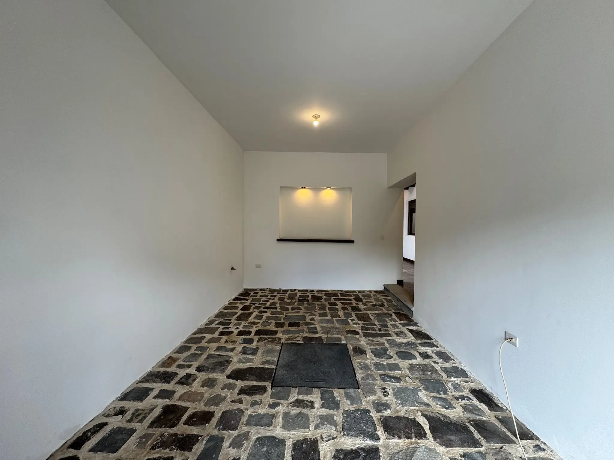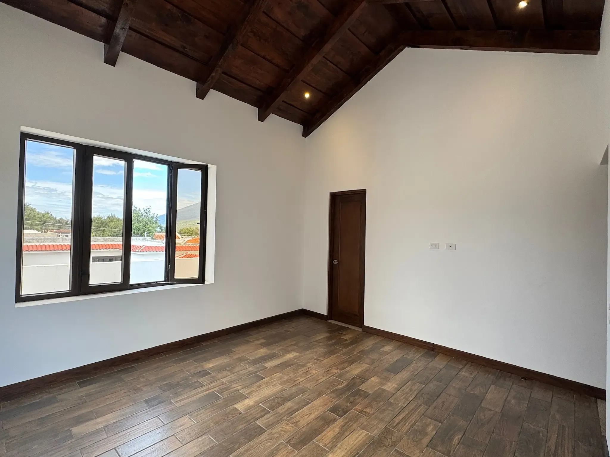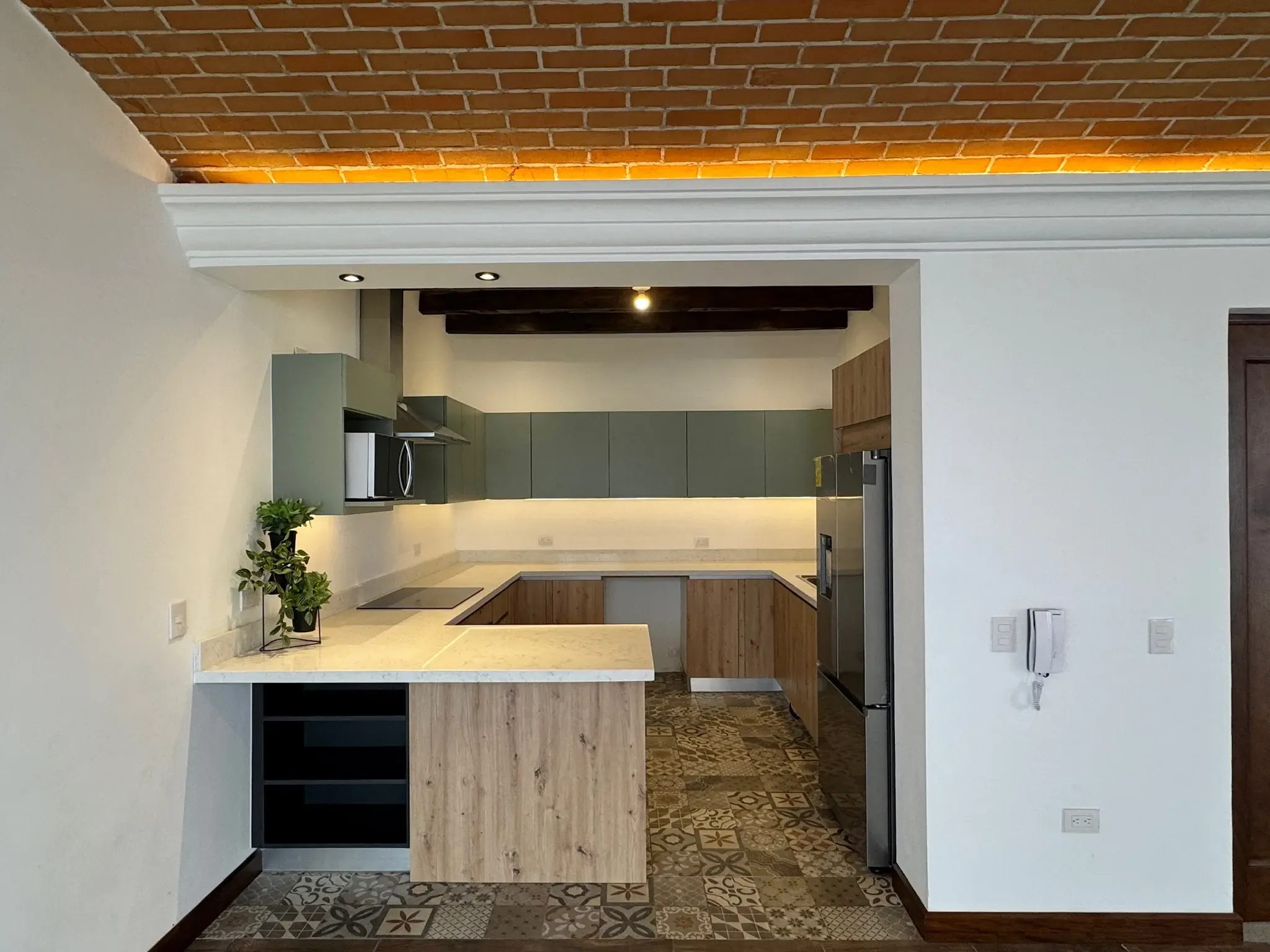 - Ingreso y Área Social: Al entrar, tenemos una puerta ancha que da acceso al área social, donde encontramos una chimenea y una impresionante bóveda de ladrillo expuesto con iluminación indirecta. El piso es cerámico imitación madera, combinando durabilidad con calidez.