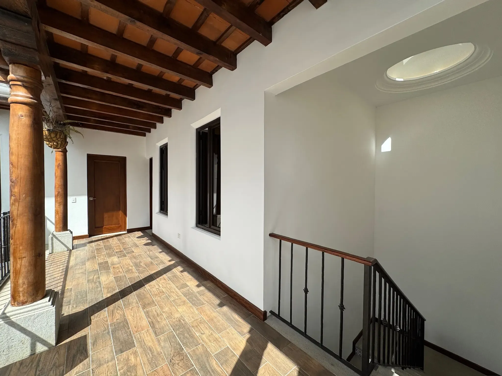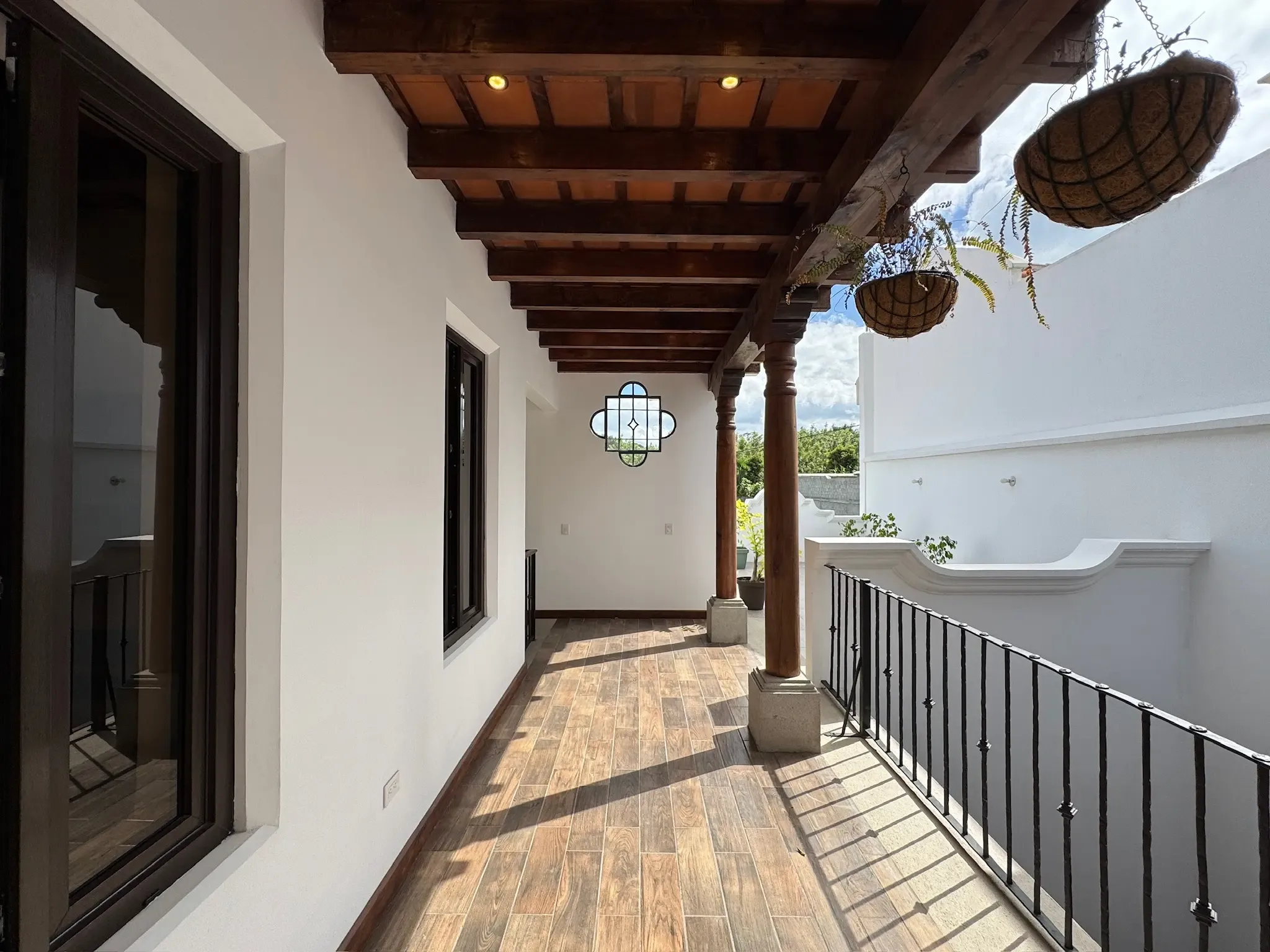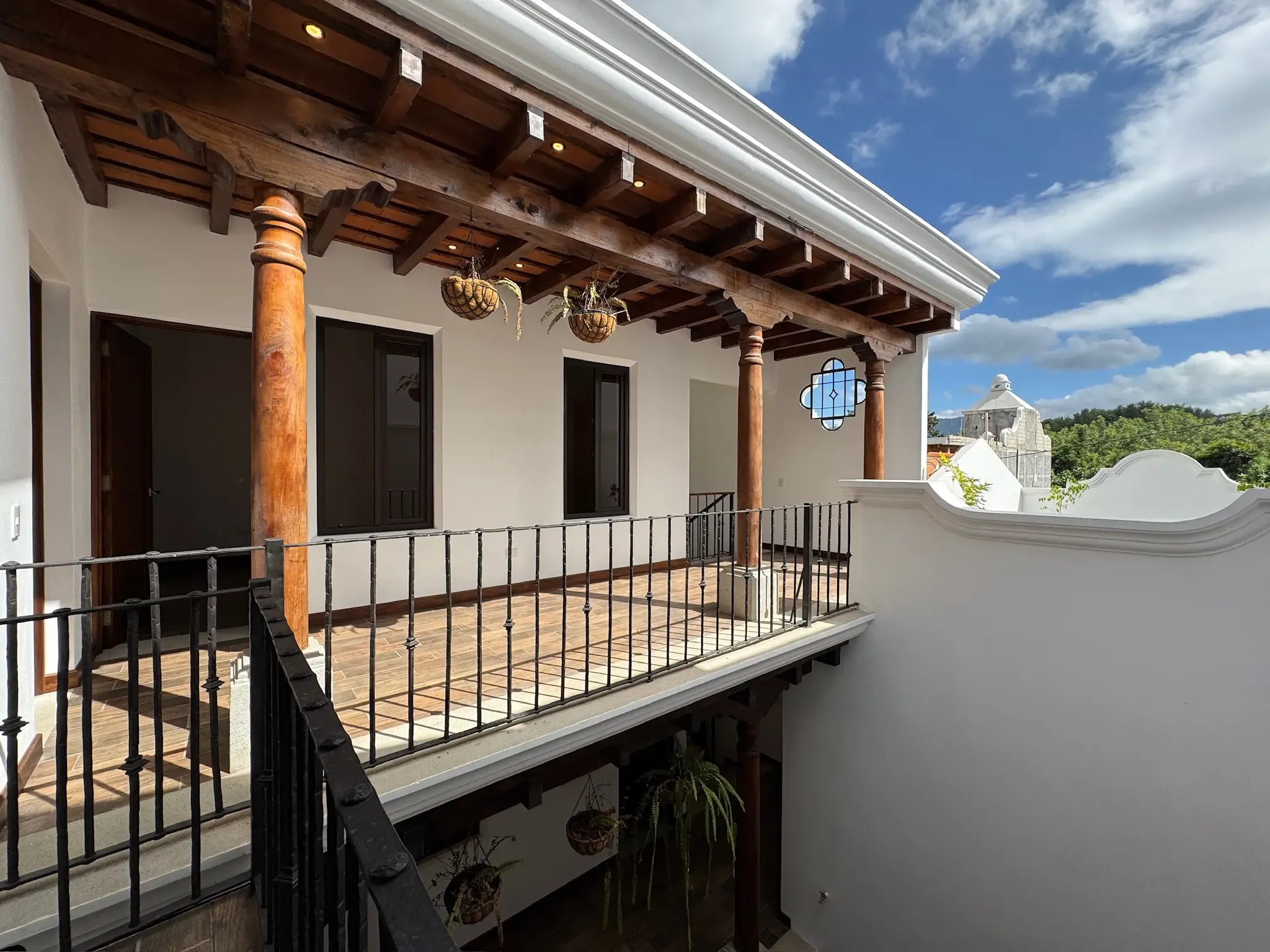 - Detalles en Hierro: Tenemos finos detalles en hierro forjado y pasamanos que combinan madera y hierro.