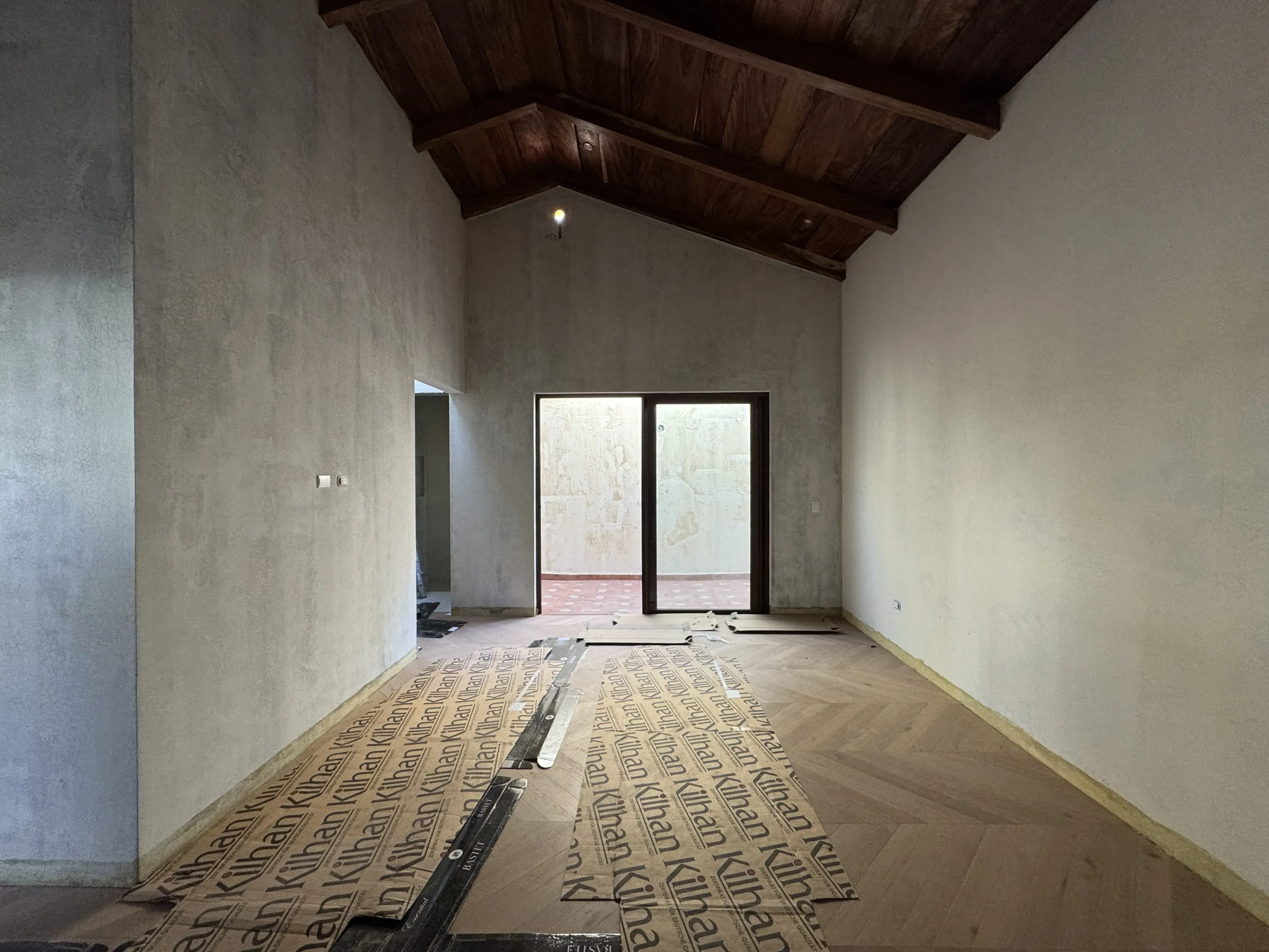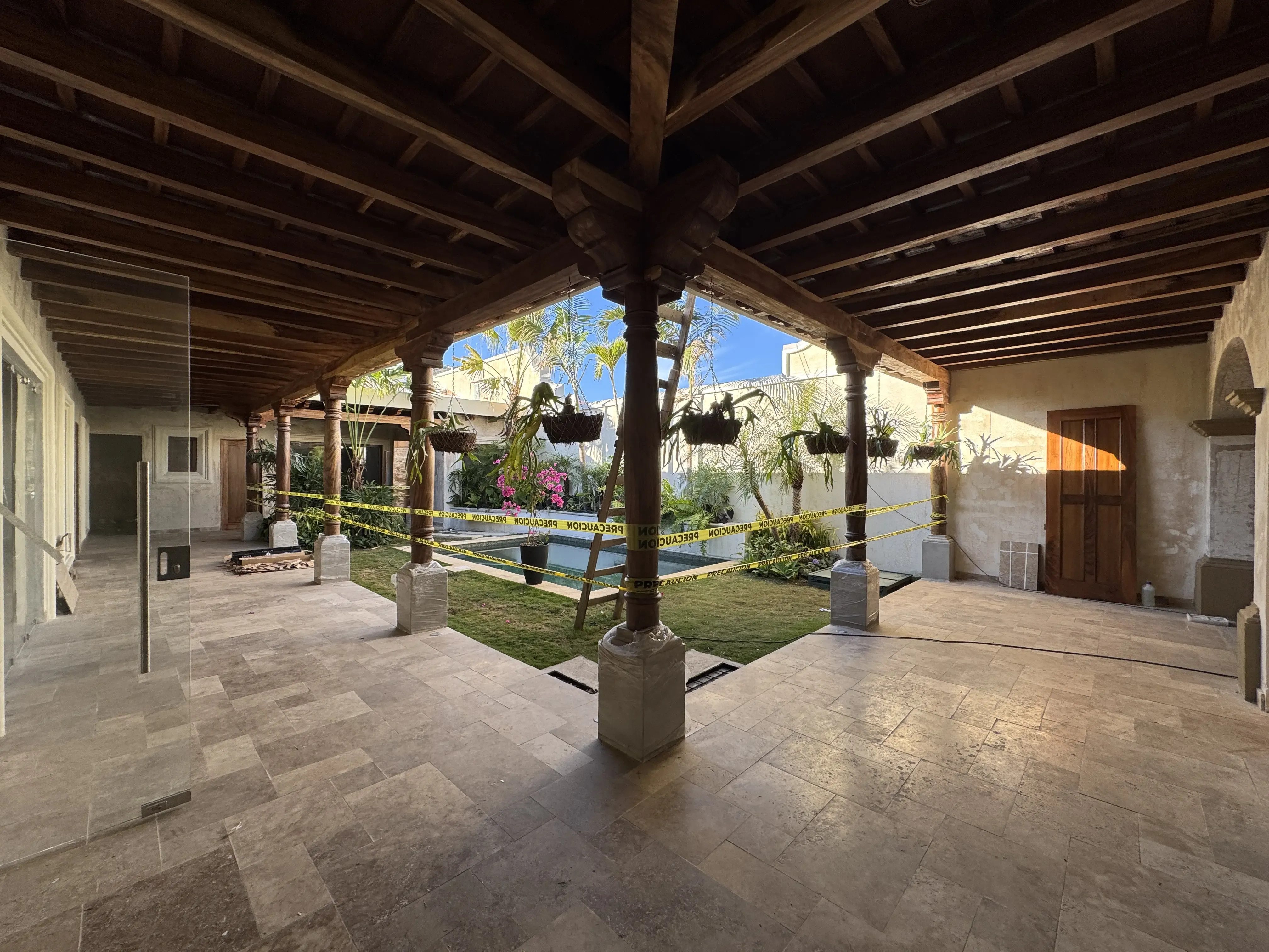 - Techos de doble altura inclinados con madera de ciprés y tejas de cerámica
