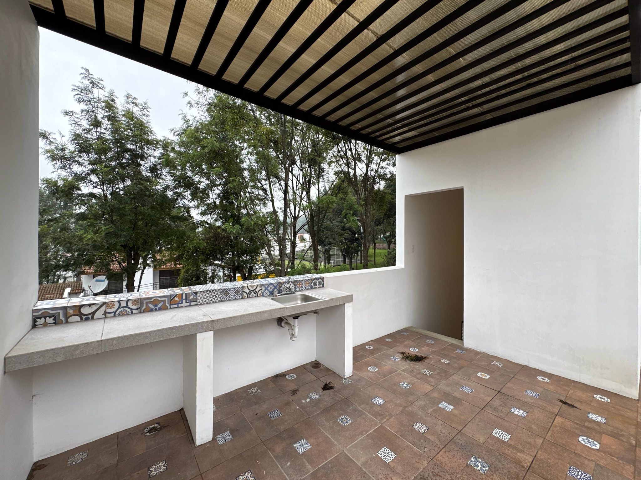 - Área de cocina equipada con top lavatrastos y mesa de preparación